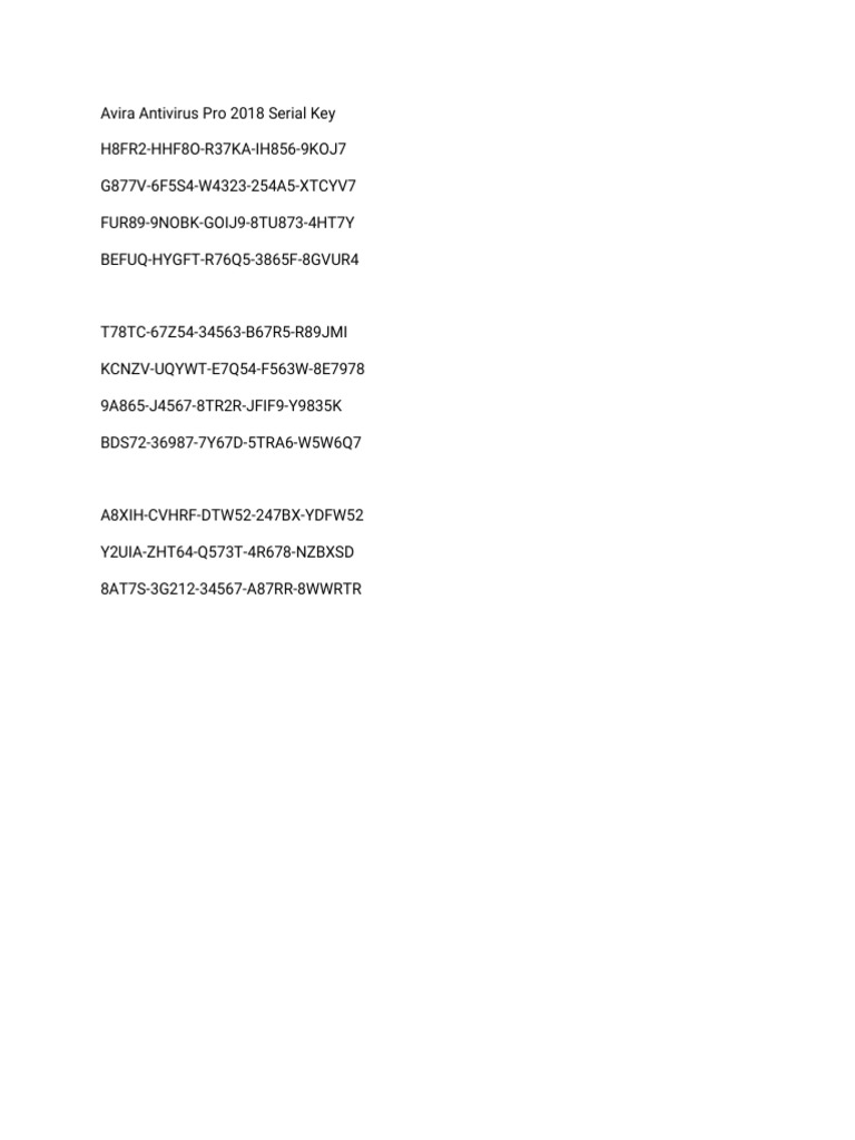 Avira antivirus pro licence key. Avira Antivirus Pro 2018 Serial Key | PDF - Scribd Avira Antivirus Pro 2018 Serial Key - Free download as PDF File (.pdf), Text File (.txt) or read online for free. Avira Antivirus Pro 2018 Serial Keys. Avira Antivirus Pro 2018 Serial Keys. Abrir o menu de navegação. Fechar sugestões Pesquisar Pesquisar. pt Change Language Mudar o idioma. close menu Idioma. Where to fill in the product key? - Official Avira Support ... I bought Avria Antivirus Pro today via goedkoopsteantivirus.nl and we received the acticationcode (productkey) via email. It said that we had to click on the link to make an Avira account and that we could than download and install the program. It also said that while we were installing the program we would be asked to fill in the product key. Avira Antivirus Pro 2022 Free for 3 Months [Windows/ Mac] - Techno360 Avira Antivirus Pro 2022 Free for 3 Months : Visit this promo page, enter your email address, and hit the "Get Free License" button. You will receive a confirmation email from Avira, click the "Accept & Install" button. Download and run the installer, enjoy the 90-day free subscription. This giveaway is available for both Windows and Mac users. Avira Antivirus Pro With Activation Key 100% Work code avira antivirus pro, avira antivirus pro free license key, avira antivirus pro full, avira antivirus pro key, avira antivirus pro key 2020, avira antivirus pro license key, avira antivirus pro latest version, avira antivirus pro license file, avira antivirus pro license key till 2099,
