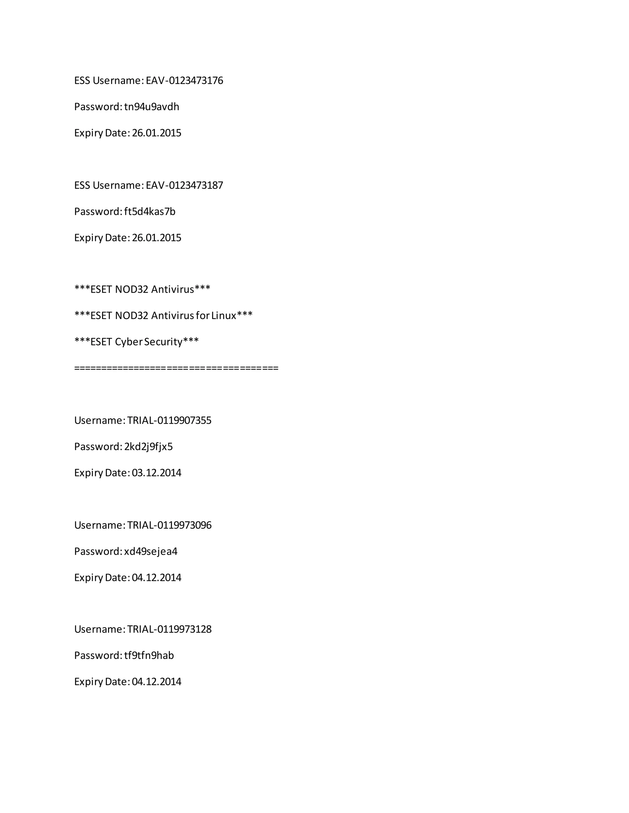 [KB333] Reset your settings password using the ESET unlock tool (11.1 ... You must right-click the ESET Unlock Utility and click Run as Administrator. Figure 1-1 If you have not yet contacted ESET Technical Support, submit a Technical Support support request containing the unlock ID that you generated in step 2, as well as the ESET-issued Username, Password and/or License key that was sent to you after purchase. eset nod32 antivirus 7 username and password - YouTube eset nod32 antivirus 7 username and password 10,016 views Dec 17, 2013 2 Dislike Share Save iGamerBozz 5 subscribers Username: TRIAL-0099186782 Password: tsf3359tk5 Exp date: 02/09/2014... Vast collection of NOD32 Antivirus license keys 2017 · GitHub - Gist Eset Mobile Security free license keys Username: EAV-0201228902 Password: 6urevkd5e5 Username: EAV-0201228901 Password: vc8mfd7b47 Expiry Date: 09.09.2017 or key for some mobiles: GD7F-X8JW-V8MS-MHG8-8H23 eset smart security username and password nod32 serial keys 8: Username: EAV-0188915190 Password: f4m5v9dt3u Expiry Date: 16.01.2018